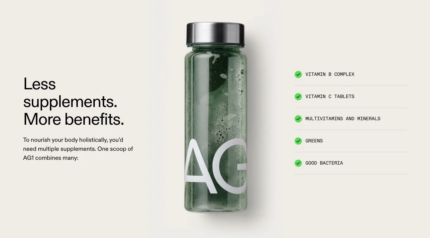 AG1 is so much more than greens. It’s your daily, drinkable scoop of vitamins, minerals, good bacteria, and whole food sourced ingredients in one. Backed by research and formulated for you, AG1 supports your health holistically.
