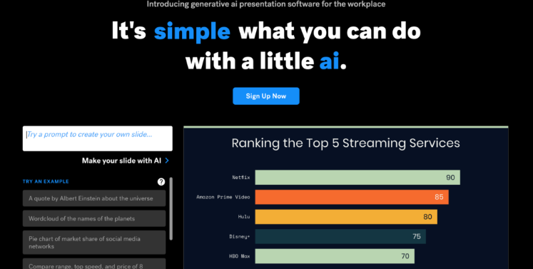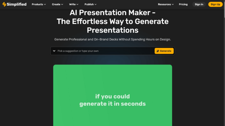 Simplified est une plateforme d'IA gratuite qui répond à tous les besoins de création de contenu. Il a récemment ajouté AI Presentation Maker, capable de générer des présentations complètes avec une simple entrée. De plus, après avoir généré un brouillon de présentation, Simplified permet aux utilisateurs de modifier/ajouter du texte, des médias et des images, y compris des images générées par l'IA, pour améliorer leur présentation. Il suffit de saisir un sujet et de regarder l'IA générer une présentation unique. Il est entièrement personnalisable, afin que vous et votre équipe puissiez collaborer et le modifier comme vous le souhaitez. Depuis la police, le texte, la couleur, les images et les sons, vous avez tout le pouvoir de créer des designs étonnants tout en économisant du temps et des efforts !